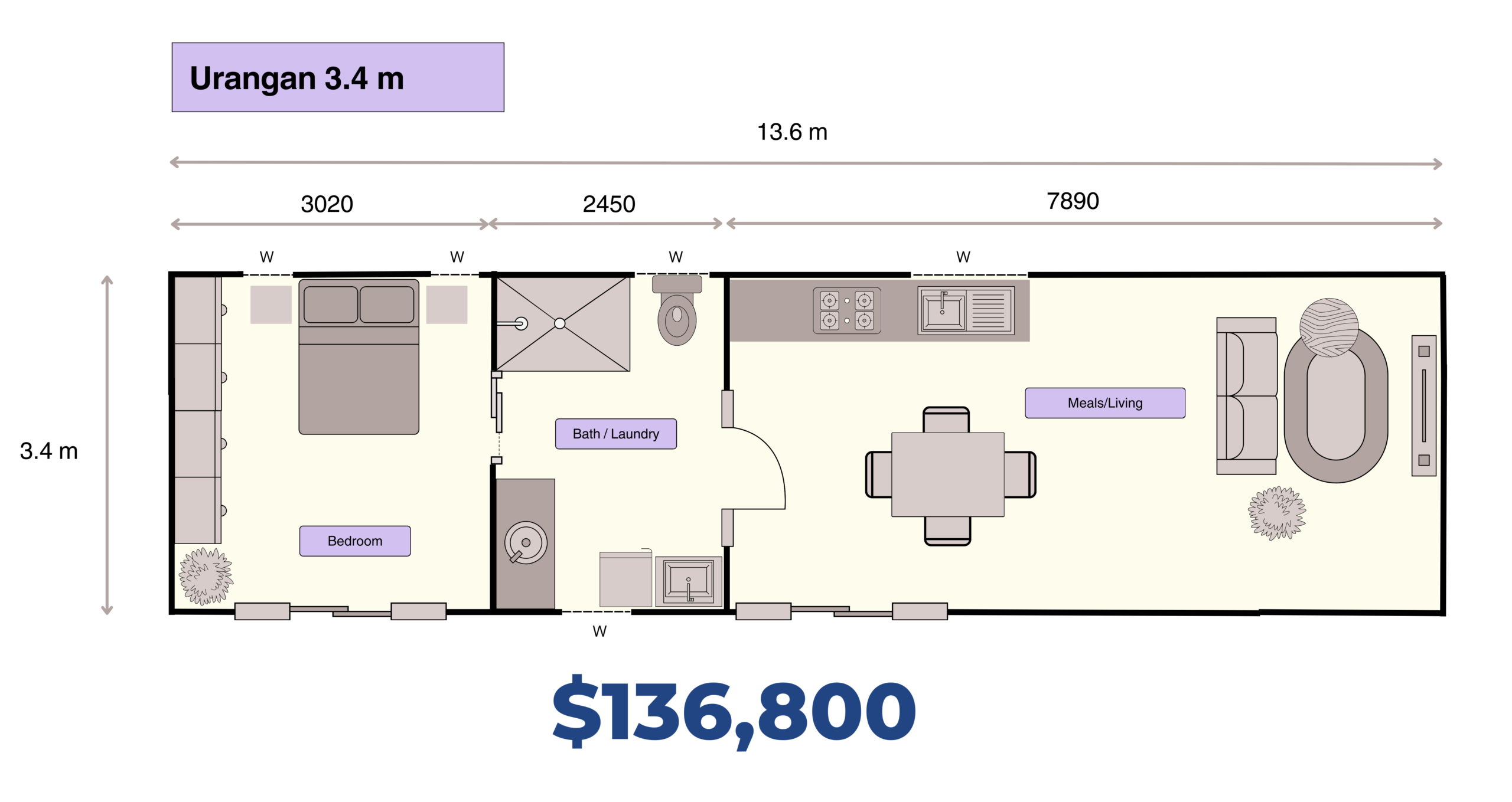 All pricing includes a standard kitchenette (pictured to the right). Below custom kitchens can be easily ordered.